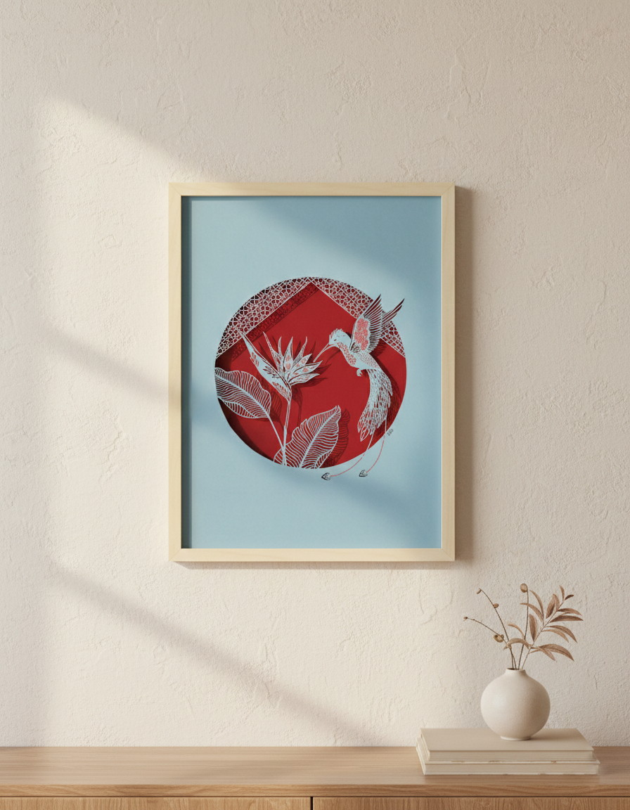 Un colibri au plumage brodé s'approche d'une fleur du paradis. Il suspend son vol devant la corolle ouverte.
