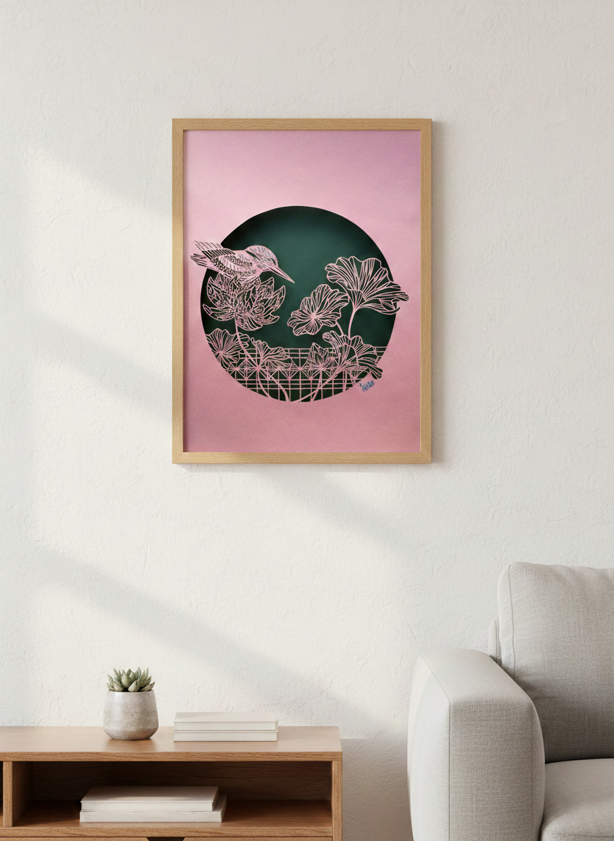 Un martin-pêcheur se tient sur une fleur de lotus, attentif aux remous de l'eau. Les grandes feuilles encadrent la scène et resserrent le regard.